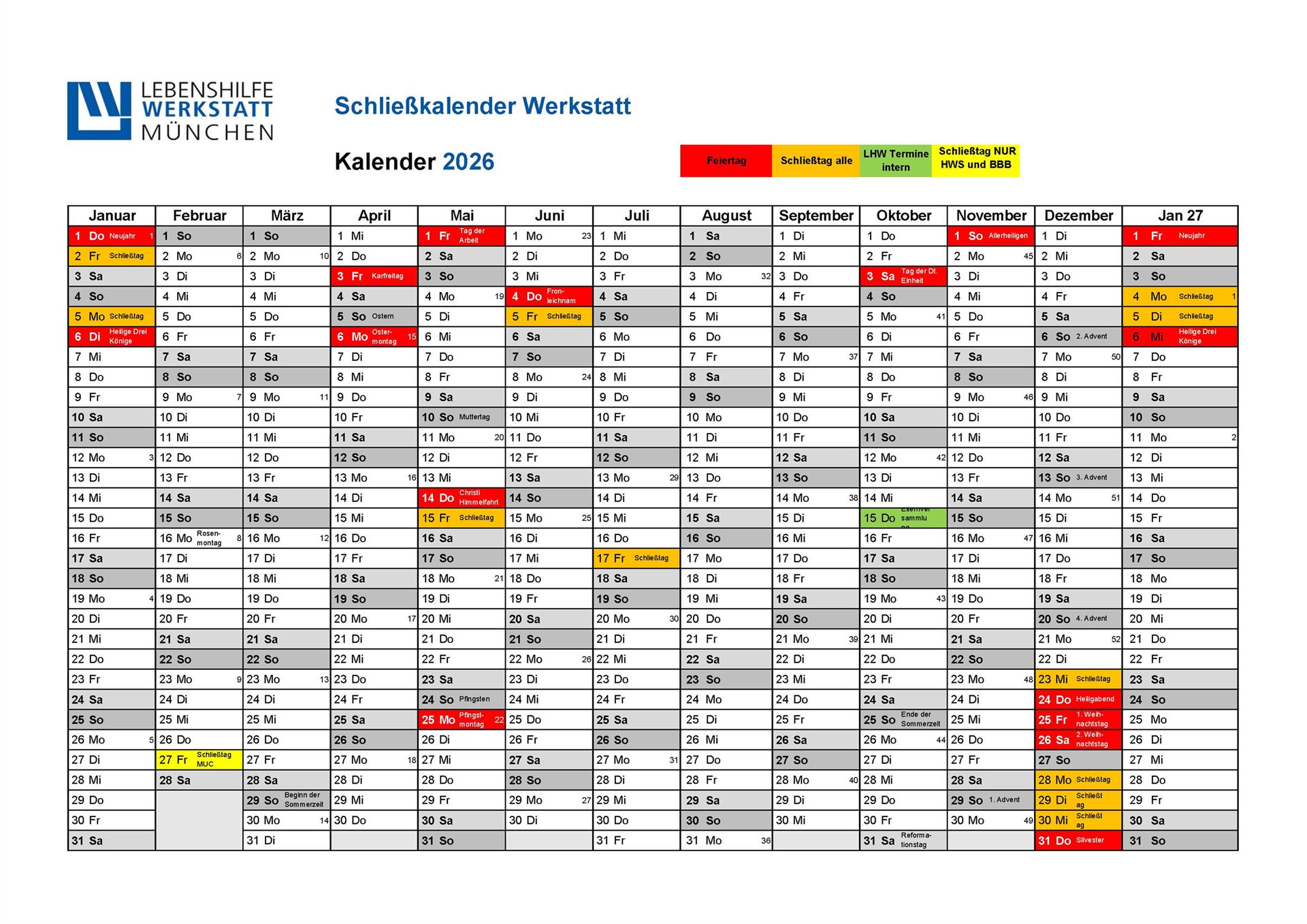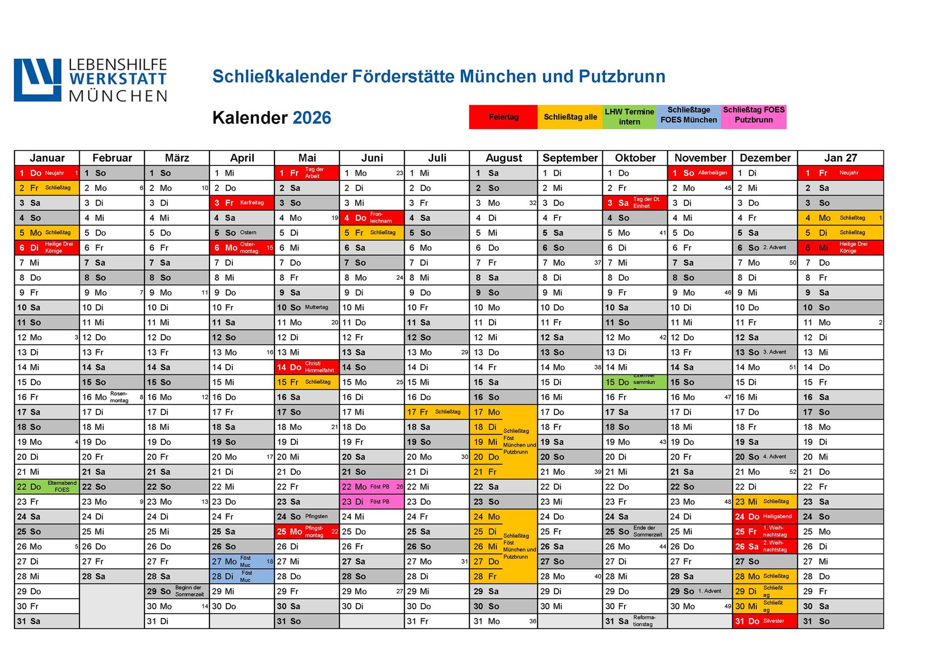 Schließkalender 2026 Förderstätte München und Putzbrunn |